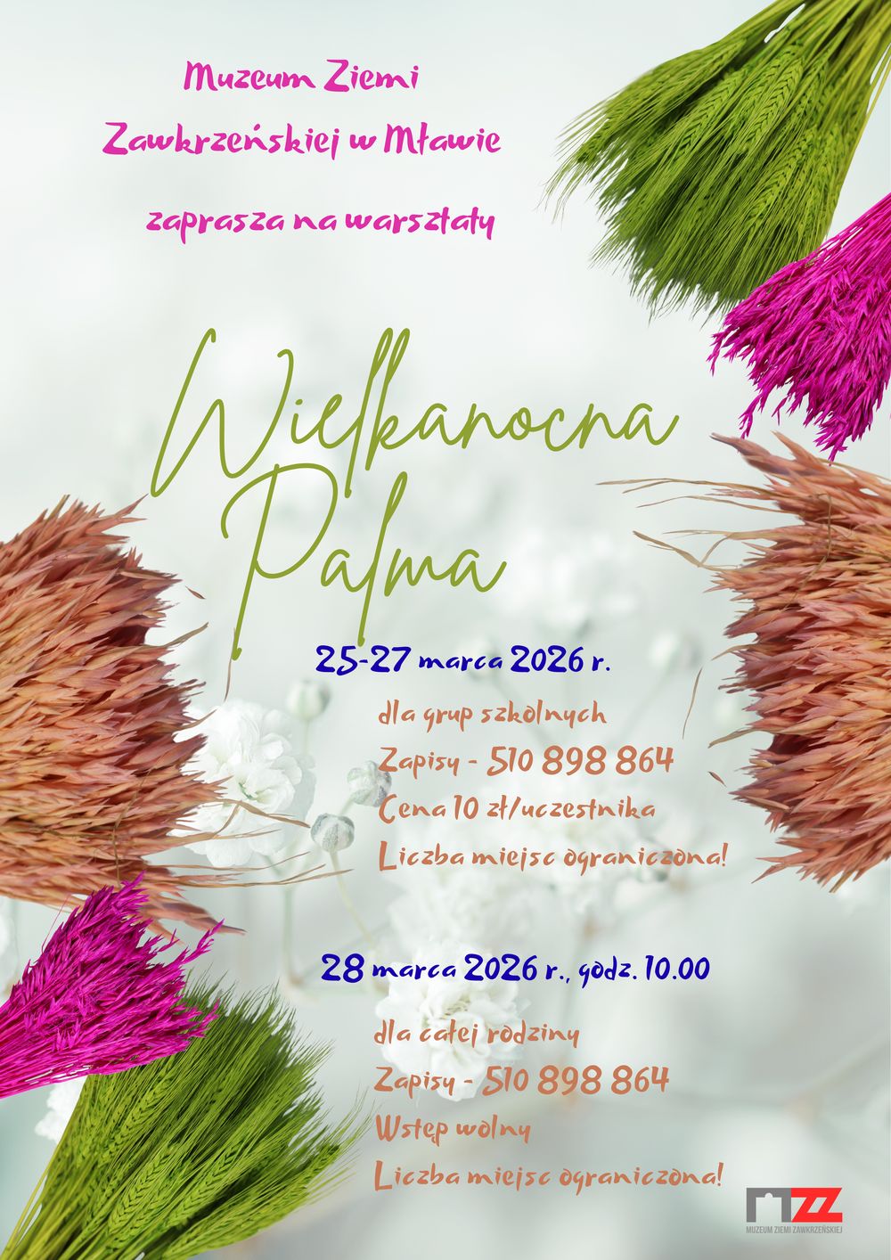 Muzeum Ziemi Zawkrzeńskiej w Mławie zaprasza na warsztaty „Wielkanocna palma”. Spotkania dla grup szkolnych odbędą się w dniach 25–27 marca 2026 r., natomiast 28 marca 2026 r. (sobota) o godz. 10.00 przygotowano zajęcia dla całych rodzin.